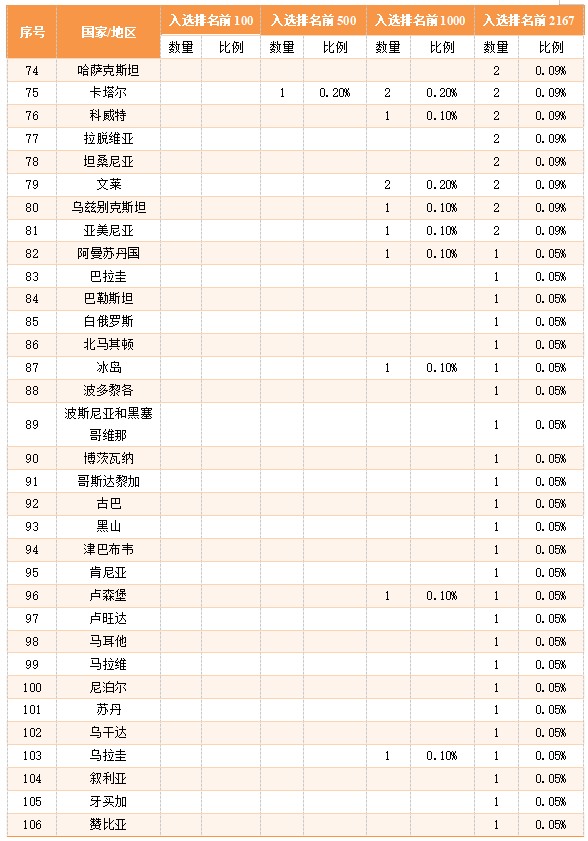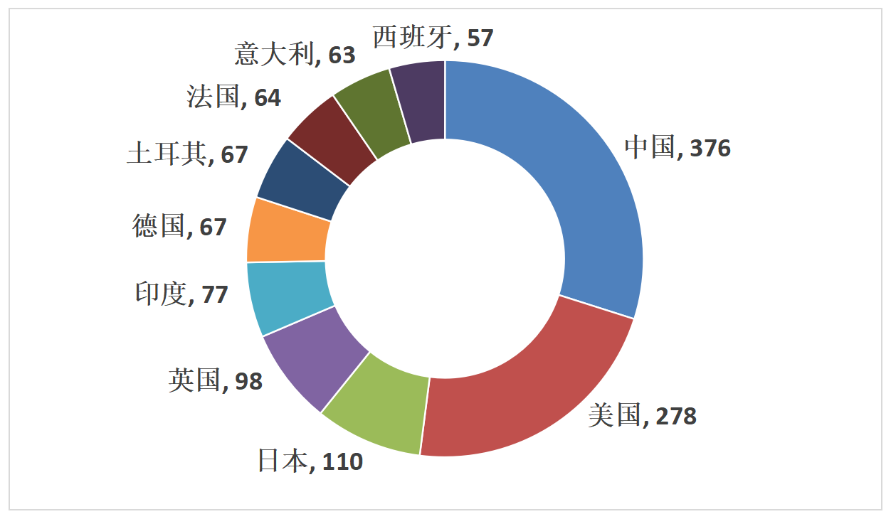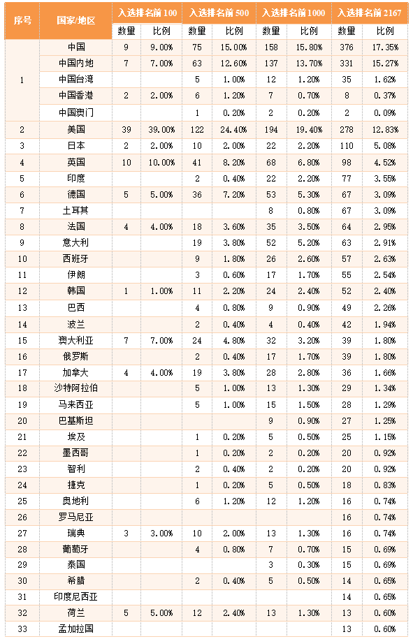 从国家/地区分布来看,中国以376所高校入选位居首位,占全球总数的17.35%(376/2167),其中中国内地331所、中国台湾35所、中国香港8所、中国澳门2所;美国以278所位列第二,占比12.83%(278/2167);日本110所,占比5.08%(110/2167),位列第三。英国(98所)、印度(77所)、德国(67所)、土耳其(67所)、法国(64所)、意大利(63所)、西班牙(57所)等国家入选数量也位居全球前十。
