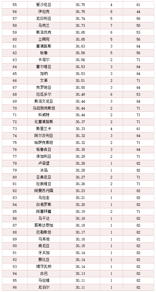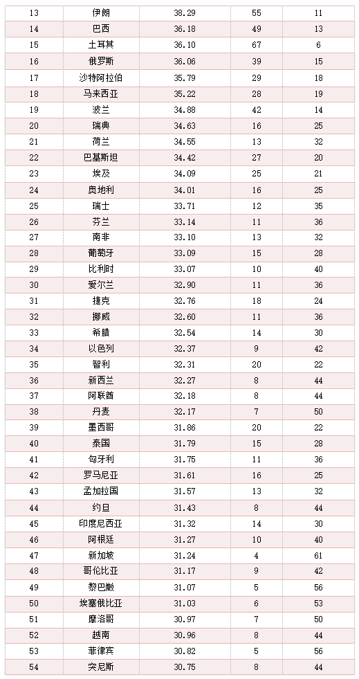 在106个国家/地区的W-TUI竞争力总排名中,中国以95.97分位居第2位,仅次于美国(100分)。英国以55.53分排名第3,德国(48.31分)、意大利(46.20分)、日本(44.09分)、法国(43.59分)、印度(41.77分)、澳大利亚(41.50分)、西班牙(41.34分)依次位列第4至第10位。