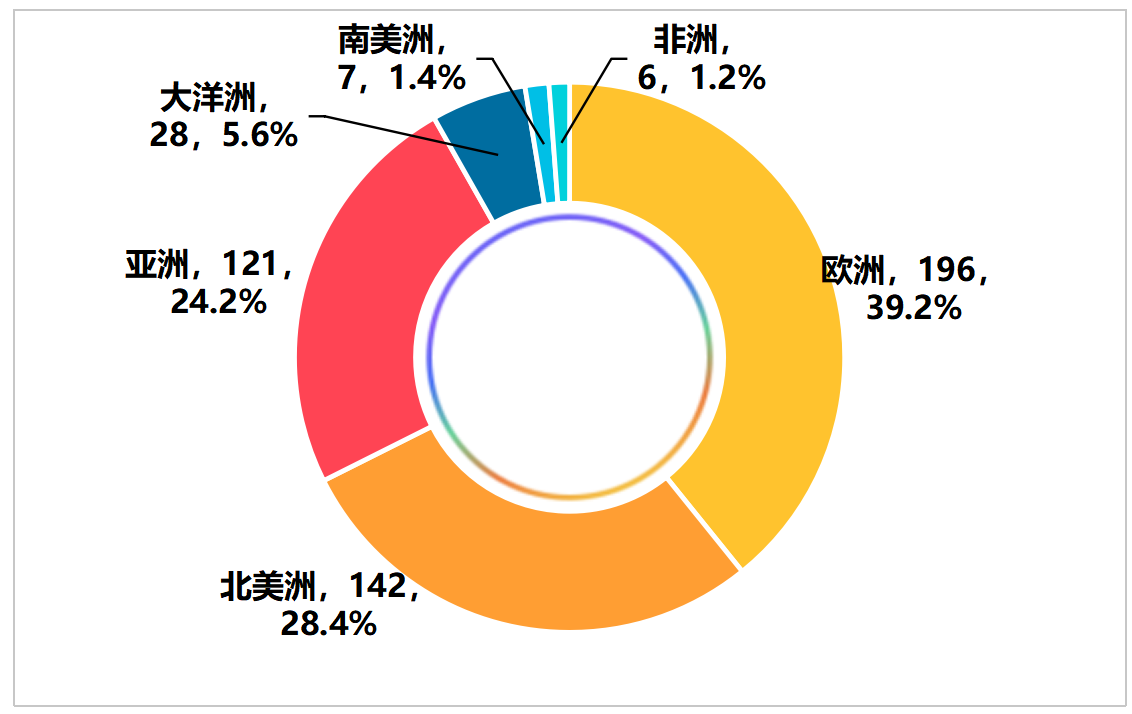 世界大学第三方指数得分排名前500的大学在六大洲的分布。