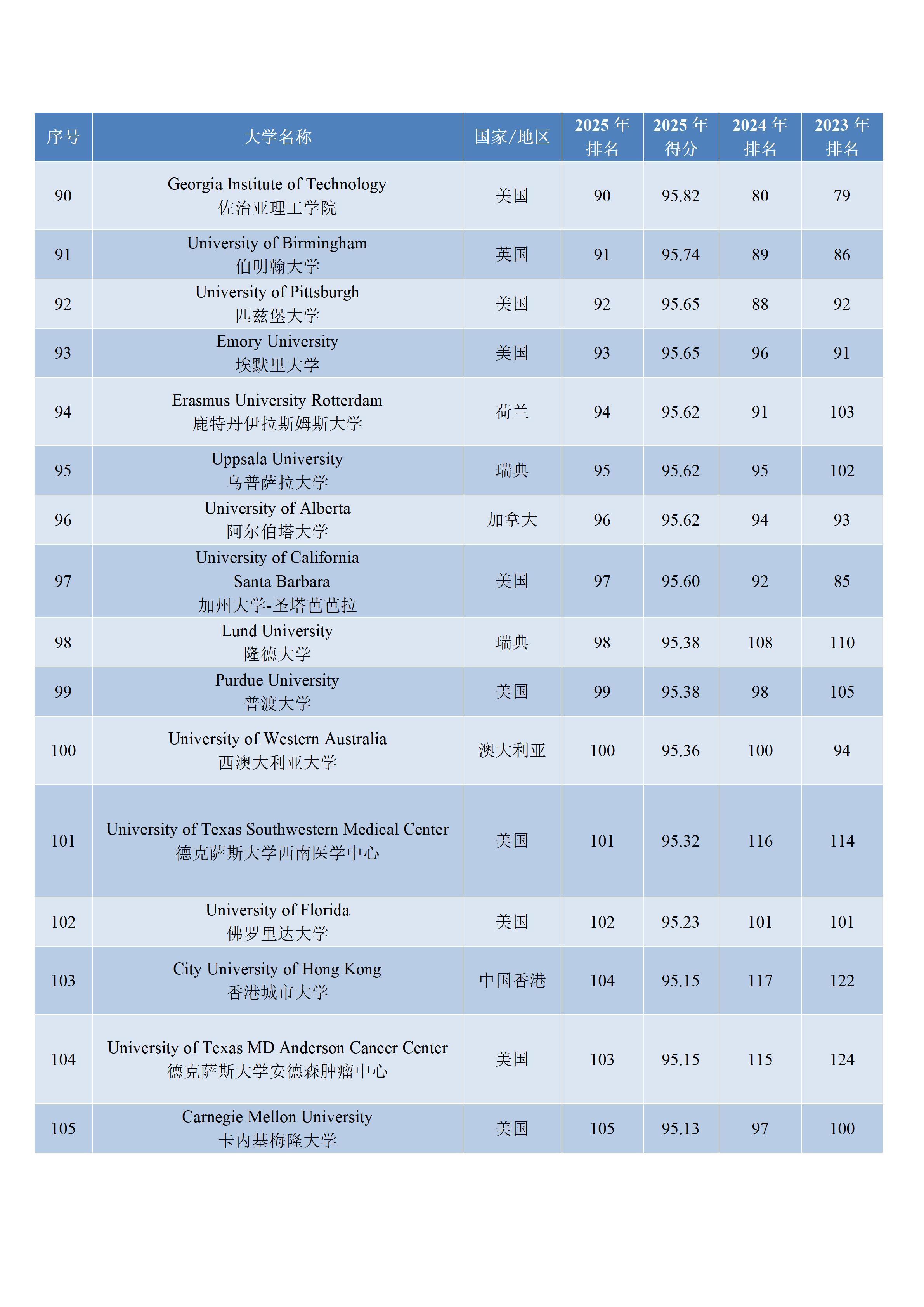 前100排名则分布在17个国家/地区,美国以39所高校居首,英国10所,中国9所(中国内地7所、中国香港2所),澳大利亚7所,德国和荷兰各5所,法国和加拿大各4所,瑞典和瑞士各3所,日本、比利时、丹麦和新加坡各2所,韩国、芬兰和挪威各1所。