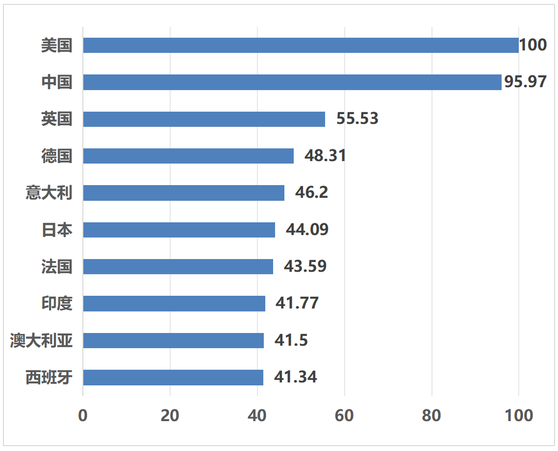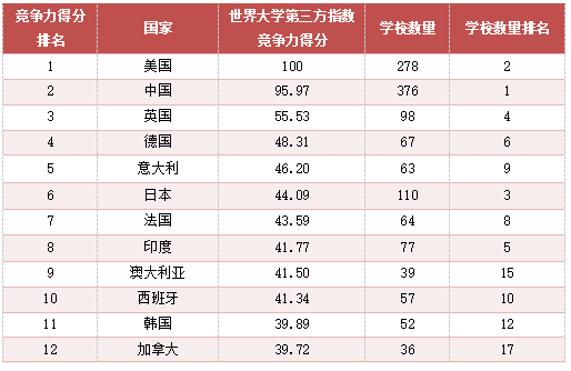 世界大学第三方指数竞争力总得分前10的国家/地区。