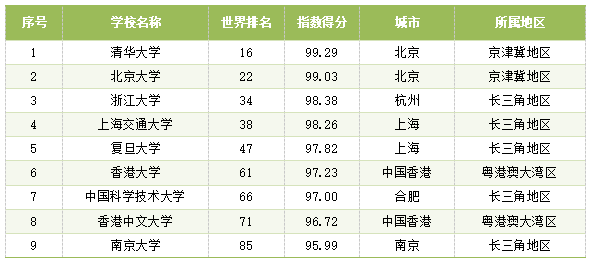 粤港澳大湾区29所高校入选,占比19.46%(29/149)。其中2所进入全球前100(香港大学,排名61;香港中文大学,排名71),6所进入全球前200,14所进入全球前500,20所进入全球前1000,24所进入全球前1500。